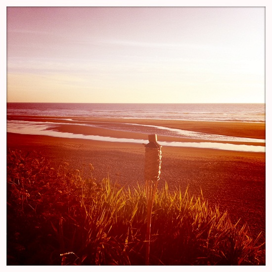 I’m back! My lovely beach vacation is all but a memory, a slew of digital photos, and lingering woodsmoke scent in my hair (that is the WORST to get out, I’ll tell you). We enjoyed the above view from our ‘lil campsite, and got down and walked that beach pretty much every day.