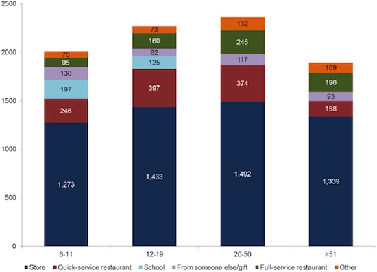 Regarding that last point, I turn back to Dr. Drewnowski’s research, published as “Energy intakes of U.S. children and adults by food purchase location and by specific food sources,” in Nutrition Journal, looked at where people purchased/acquired most of their calories in a single day: stores, quick-service restaurants/pizza, full-service restaurants, school cafeterias or food provided by someone else (including food gifts). Here’s the breakdown, by age: